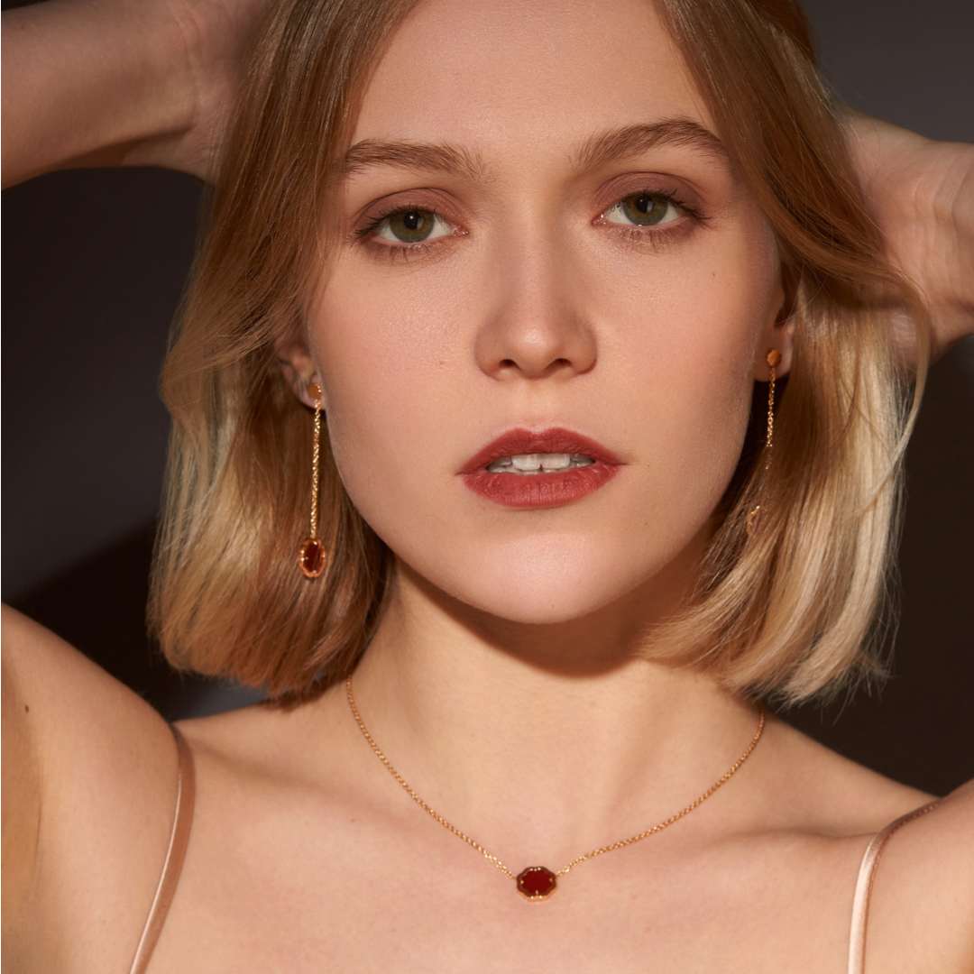 STEPHANIE KALCK selects Carnelian displaying straight, uniform veins, predominantly from the best mines in the world, and also works with the reputable workshop in Germany for stone cutting. The st...