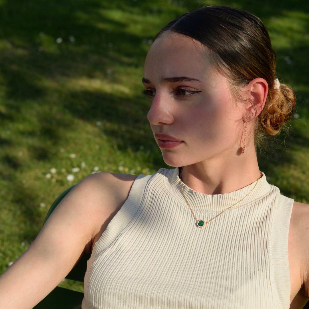 Malachite jewelry pieces from STEPHANIE KALCK can work beautifully with spring outfits, adding a touch of elegance and nature to your look.